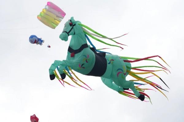 下午的风筝大众赛则更加注重参与性和竞技性。比赛开始,运动员们在场地上奔跑,手中的线轴飞快地转动,风筝随着风势逐渐升空。有的风筝迅速攀升,有的则在天空中盘旋,还有的风筝在运动员的巧妙操控下,做出了各种难度的动作。