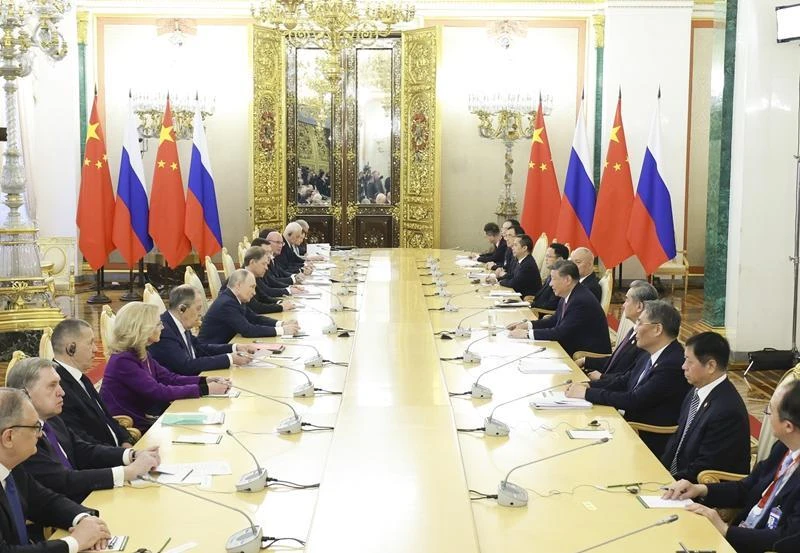 当地时间5月8日上午,俄罗斯总统普京同中国国家主席习近平在莫斯科克里姆林宫举行会谈。这是两国元首举行大范围会谈。新华社记者 姚大伟 摄