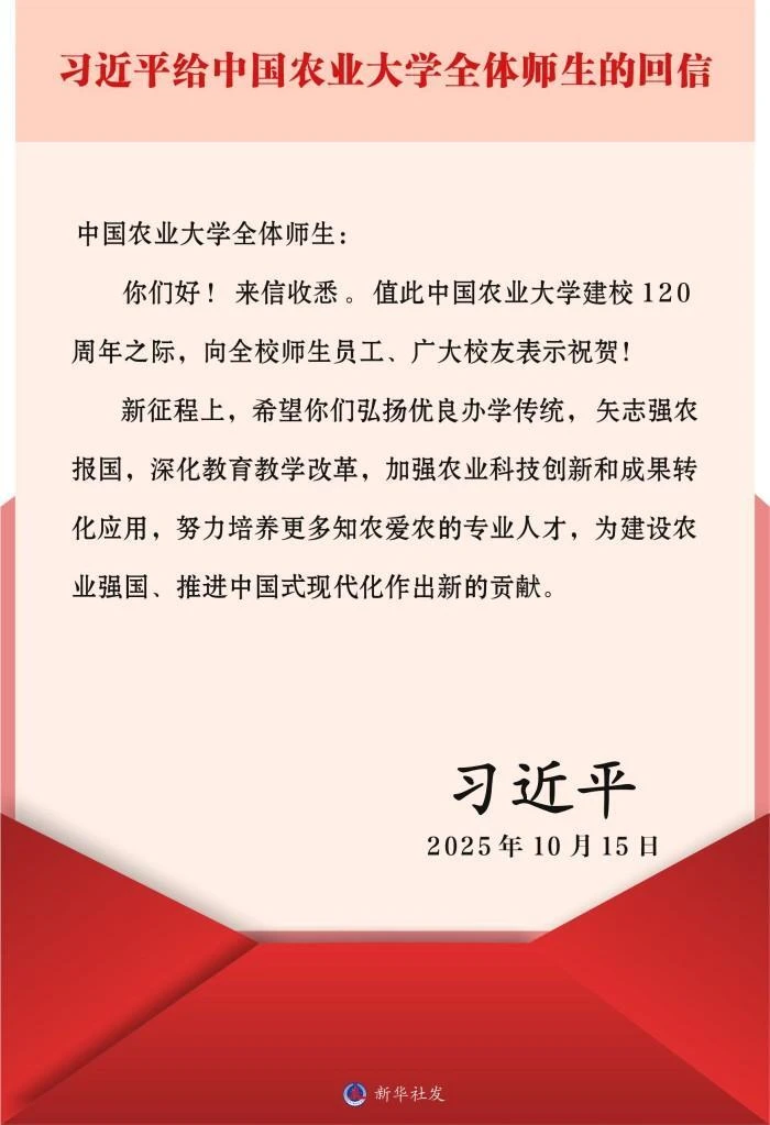 近日,中共中央总书记、国家主席、中央军委主席习近平给中国农业大学全体师生回信,在中国农业大学建校120周年之际,向全校师生员工、广大校友表示祝贺。