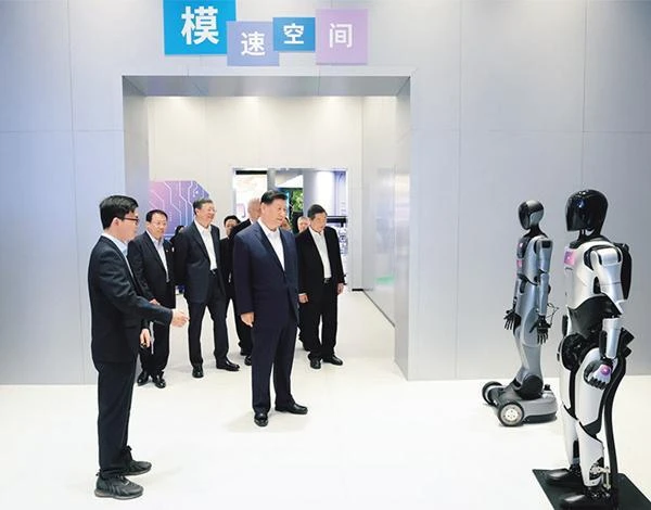 2025年4月29日,中共中央总书记、国家主席、中央军委主席习近平在上海考察。这是习近平在位于徐汇区的上海“模速空间”大模型创新生态社区,听取相关技术研发和企业生产经营介绍。新华社记者 王晔/摄