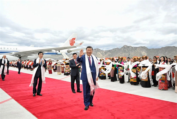 8月20日中午,中共中央总书记、国家主席、中央军委主席习近平率中央代表团乘专机抵达拉萨,出席西藏自治区成立60周年庆祝活动。这是习近平向欢迎群众挥手致意。新华社记者 谢环驰 摄