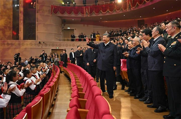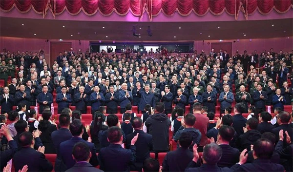 8月20日晚上,庆祝西藏自治区成立60周年文艺晚会《雪域欢歌》在西藏大剧院举行,中共中央总书记、国家主席、中央军委主席习近平同西藏自治区各族干部群众共同观看演出。这是习近平向大家挥手致意。新华社记者 燕雁 摄