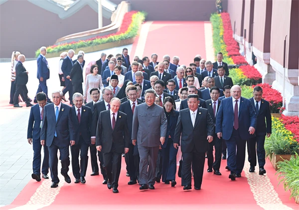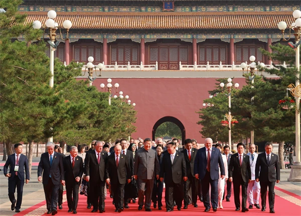 9月3日,纪念中国人民抗日战争暨世界反法西斯战争胜利80周年大会在北京天安门广场隆重举行。这是大会开始前,中共中央总书记、国家主席、中央军委主席习近平同出席大会的外方代表团团长前往天安门城楼。新华社记者 丁林 摄