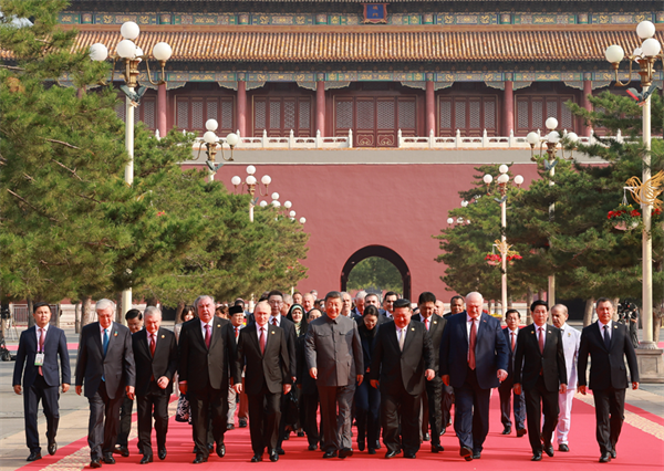 9月3日,纪念中国人民抗日战争暨世界反法西斯战争胜利80周年大会在北京天安门广场隆重举行。这是大会开始前,中共中央总书记、国家主席、中央军委主席习近平同出席大会的外方代表团团长前往天安门城楼。新华社记者 申宏 摄