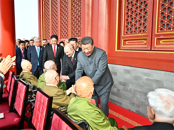 9月3日,纪念中国人民抗日战争暨世界反法西斯战争胜利80周年大会在北京天安门广场隆重举行。这是大会开始前,中共中央总书记、国家主席、中央军委主席习近平同抗战老战士老同志代表亲切握手,向他们表示崇高敬意。新华社记者 燕雁 摄