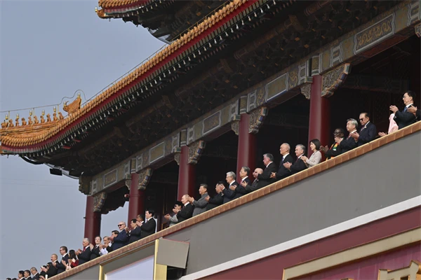 9月3日,纪念中国人民抗日战争暨世界反法西斯战争胜利80周年大会在北京天安门广场隆重举行。这是中共中央总书记、国家主席、中央军委主席习近平等在天安门城楼上。新华社记者 饶爱民 摄