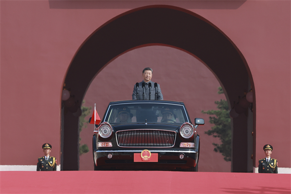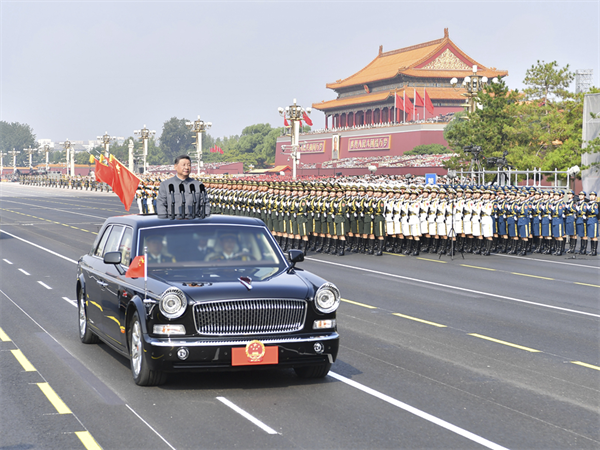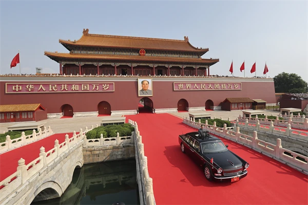 9月3日,纪念中国人民抗日战争暨世界反法西斯战争胜利80周年大会在北京天安门广场隆重举行。中共中央总书记、国家主席、中央军委主席习近平发表重要讲话并检阅受阅部队。这是习近平乘检阅车,经过金水桥,驶上长安街。新华社记者 刘卫兵 摄