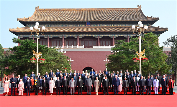 9月3日,纪念中国人民抗日战争暨世界反法西斯战争胜利80周年大会在北京天安门广场隆重举行。大会开始前,中共中央总书记、国家主席、中央军委主席习近平和夫人彭丽媛在端门外广场迎接出席大会的外方代表团团长及其配偶,并同他们合影留念。新华社记者 申宏 摄