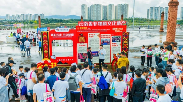 非遗体验区是整场活动的“人气王”。楚雄彝绣传承人李长征、罗珺带来数十件彝绣精品,从背包到绣花鞋,每一件都充满彝族美学元素。选手们纷纷在展板前拍照“打卡”,了解彝绣技艺,参与互动问答,零距离感受“指尖上的非遗”。