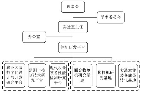 本实验室实行理事会领导下的主任负责制,组织机构包括:实验室理事会、学术委员会和办公室,建有农业装备数字化设计与开发、农业装备监测与控制、现代农业装备性能检测三大创新研发平台。在研发平台下设联合收割机、拖拉机两大研究基地,分别建在江苏沃得农业机械有限公司和常州东风农机集团有限公司,具体组织结构如图1所示。