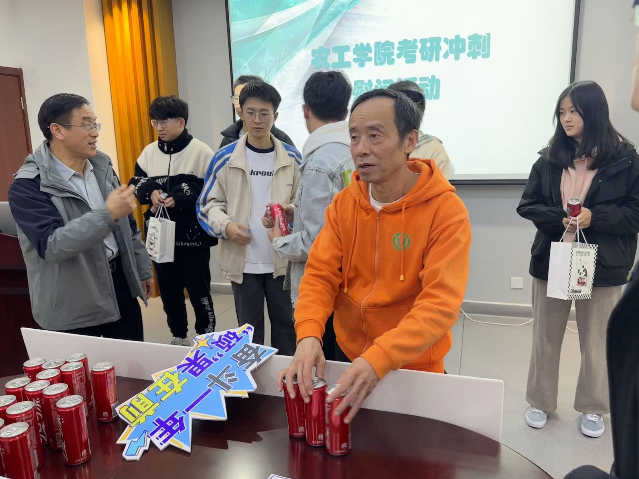 会议伊始,廖志凌对历年报考人数、考研形势进行分析,对同学们的努力表示肯定,并提出五点建议:第一,坚定信心,不怕困难;第二,坚持拼搏,不言放弃;第三,注意方法,提高实效;第四,劳逸结合,注重身体;第五,相互帮助,结伴而行。随后,凌智勇从就业现状、薪资水平、工作情况等方面,分析了本硕的区别与读研的优势,勉励同学们一定要相信自己,不轻言放弃;周军分专业讲解了学院历年的考研报考及录取情况,他希望同学们放松心态、保持状态,争取考出理想的成绩。最后,学院领导和老师向同学们发放考研慰问礼品,祝福同学们一战“橙”硕、心想事“橙”。
