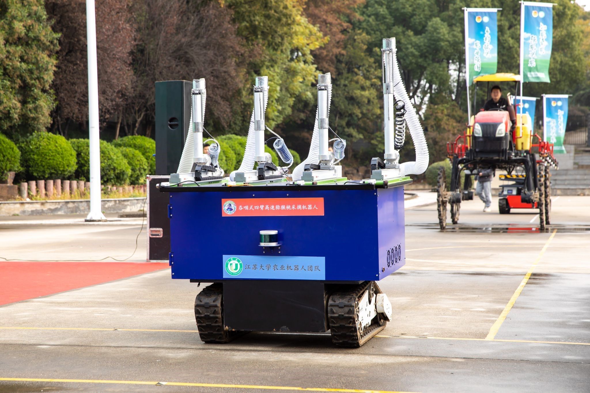 Kiwi fruit picking robot, hydraulic four-wheel drive self-propelled electrostatic spray bar spray, pure electric drive omnidirectional intelligent leveling agricultural machinery general chassis, humanoid double arm grape high-speed harvesting robot, self-propelled strawberry transplanter, key technologies and equipment of rice wheat intelligent low loss combined harvesting in complex scenes in hilly and mountainous areas and other intelligent agricultural machinery innovation equipment were displayed on the scene.