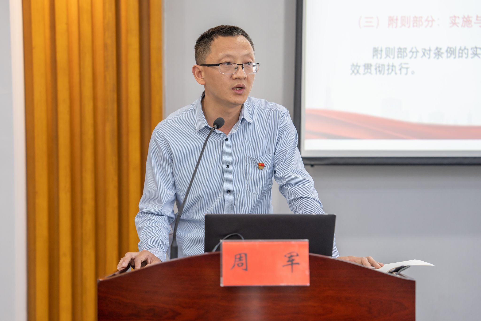 学院党委副书记、副院长、纪检委员周军结合工作实际为大家详细解读了《中国共产党纪律处分条例》,并通过涉及公务接待、经费使用、师生关系等领域的高校违纪违规违法典型案例对现场人员进行了警示教育。会议现场,周军通过分析意识形态领域典型案例,带领大家深入学习了落实意识形态工作责任制相关责任、工作方法及注意事项。